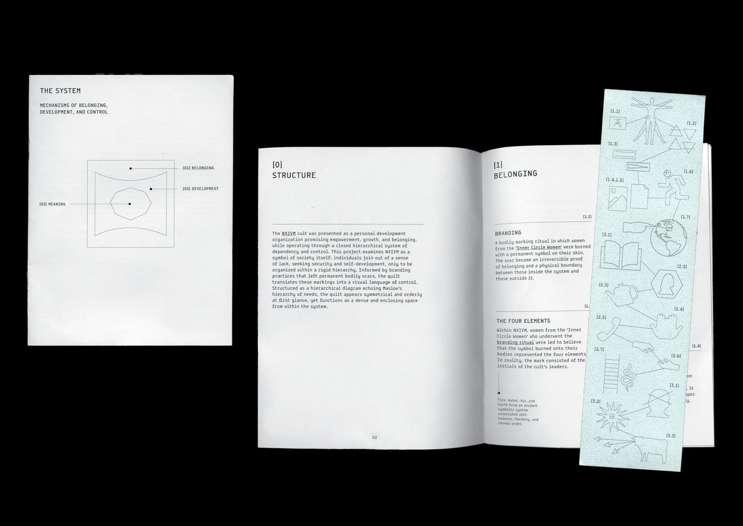 Drawing from the NXIVM cult, the quilt is structured as a hierarchical diagram that echoes bodily branding and systems of advancement.