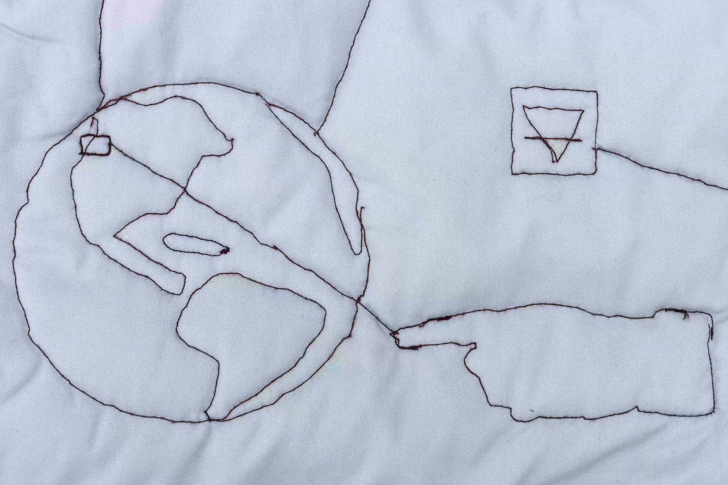 Its stitched surface transforms promises of belonging, growth, and meaning into a visual language of control- orderly on the surface, yet enclosing from within.